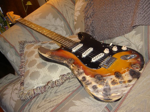 The way I see it : He shot the guitar or burned it with cigarettes for being out of tune ! If his friends ask how he got that relic look, they won’t believe that he “aged it naturally, like a fine wine.”