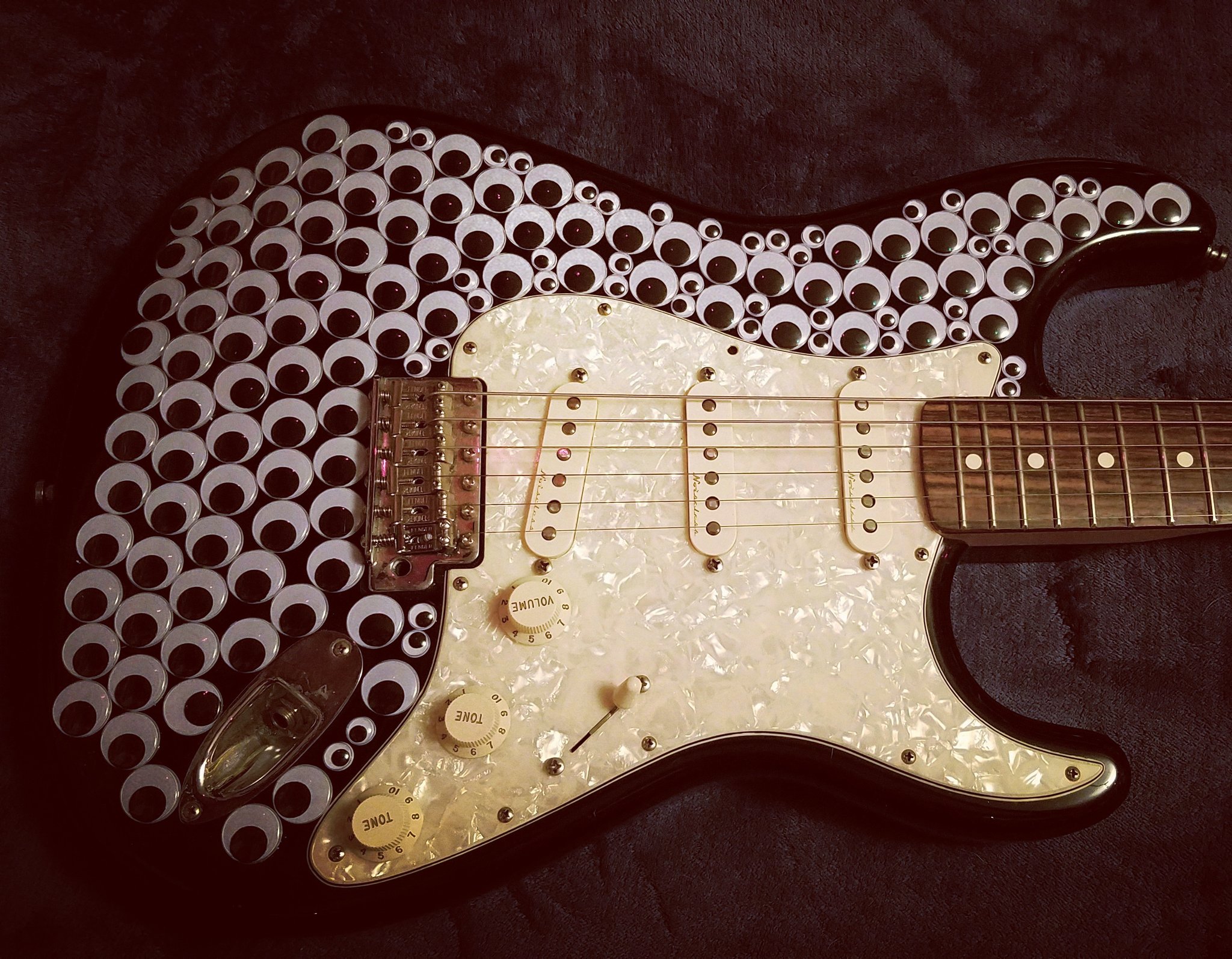 What a funny idea to stick that much googly eyes on the top of this Stratocaster !
