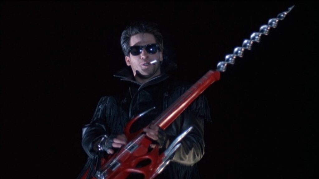 How funny it must have been to be a staff writer for a slasher film in the 80s. I can imagine the meeting going that way : “You know what this scene needs? A guitar with a functional drill inside!” and someone tops that idea “Yeah! And you know what this drill guitar needs? A massive drill bit for a headstock!” and so on, and so on…