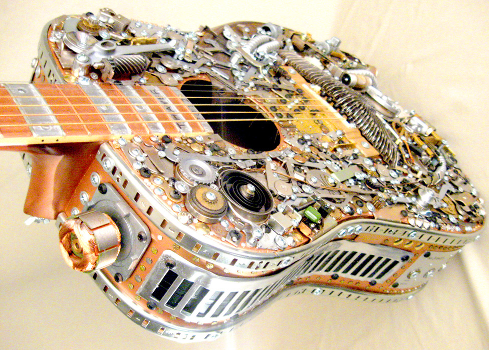 I have nothing against steampunk guitars though this one seems a bit overloaded to be easy to play ! It probably has a purely decorative role though.