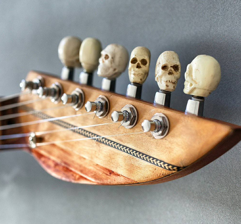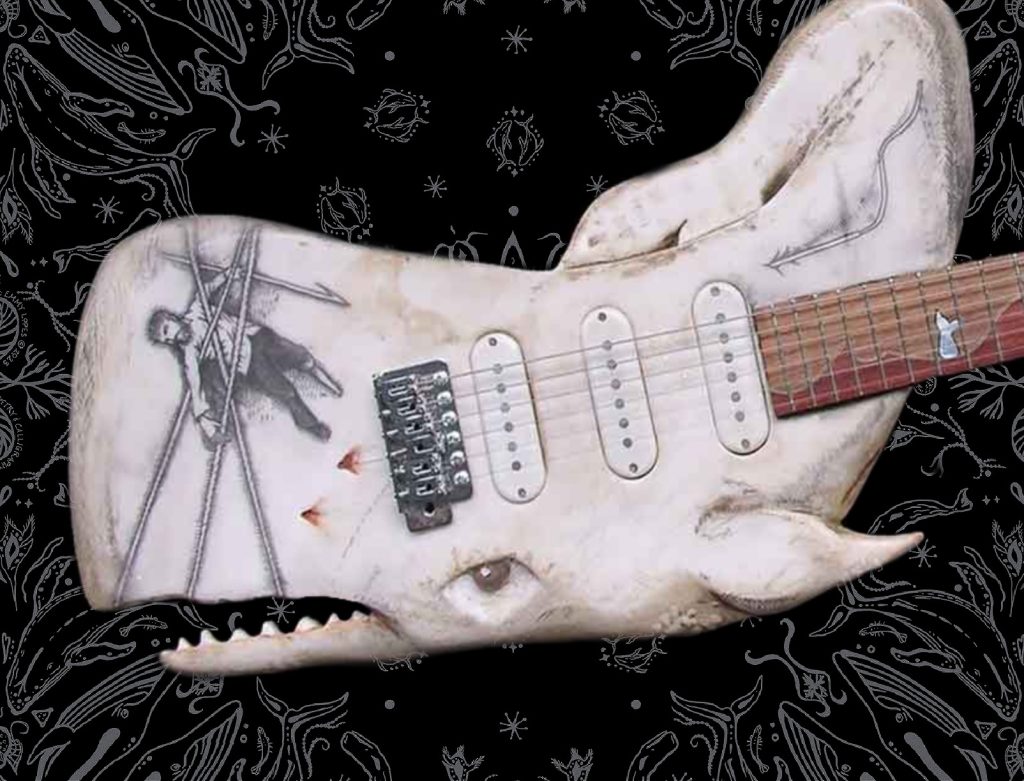 - Captain Ahab: Mad Captain Ahab symbolizes unbalanced leadership. His quest for dominion over nature imperiled an entire world crew. The headstock of the Whale Guitar is a whaling boat with its crew of 6 doomed whalers! We get it, the whole thing is a metaphor, but we still can’t help imagining Ahab shredding a solo on this bad whale! And boy that is hilarious to picture him, or any guitarist for that matter, fighting to just hold it correctly.