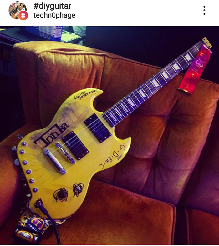 But this Tonka isn’t a toy truck, no sir. It’s a headless DIY yellow SG guitar with the Tonka name emblazoned on the body. Because why settle for a traditional, well-crafted instrument when you can have a cheap plastic toy-inspired guitar, right?
