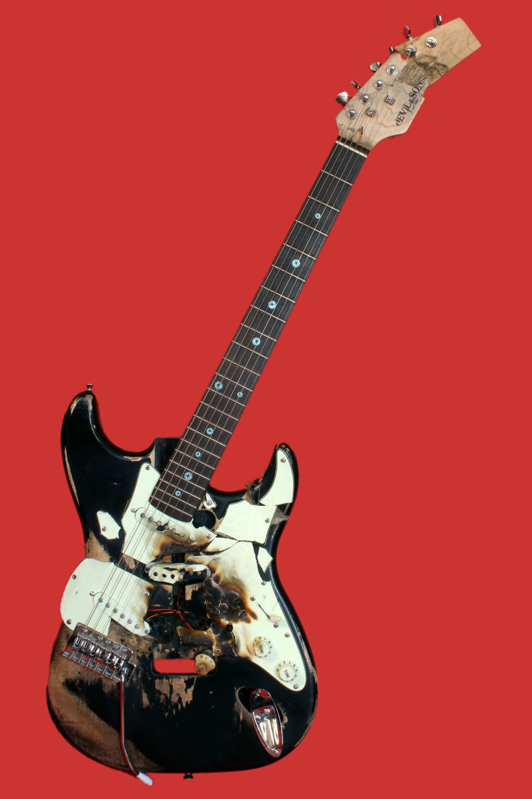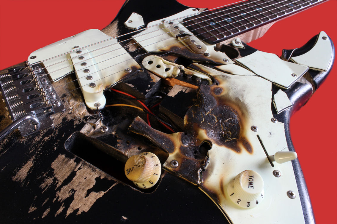 The End of the Road extreme relic is the work of Devils & Sons luthier Daniel Devilson. These guitars are made from new components. Despite their extreme road worn and damaged look, the End of the Road guitars are supposed to play like untouched guitars.