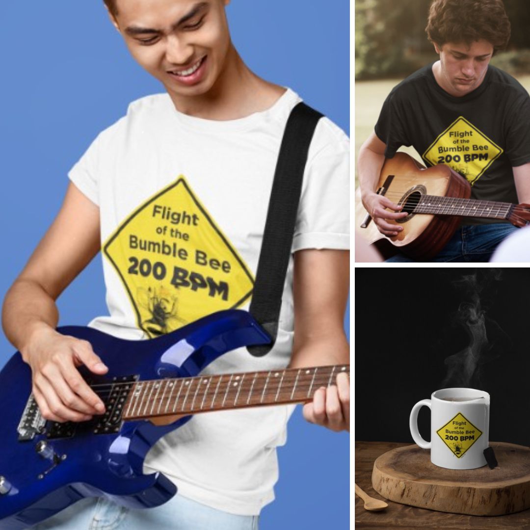 So we came up with the Flight of the Bumble Bee Speed Limit series of t-shirts and mugs! That’s right, folks.