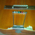 He glued the original headstock veneer to the body of the guitar. Then he routed the back out for tuners. The original serial number section of the headstock is drilled into the back of the guitar. This guitar has 3 gearless Steinberger tuners and 3 Kluson style.