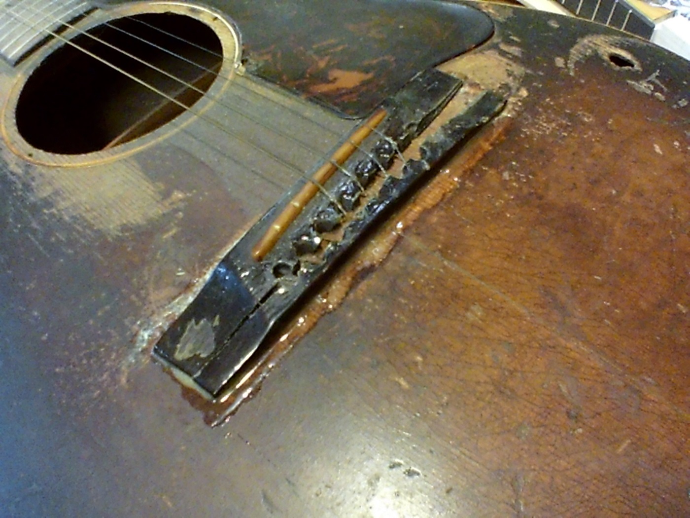 A new customer came into the shop today. His ’58 Gibson Acoustic needed adjustment. He says the intonation is off and he can’t get it to tune. I open the case and see the bridge. Note that the strings are epoxied into the holes…. Ugh!