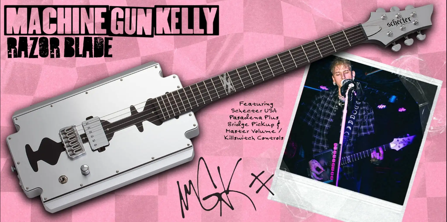 Well, just when you thought you’d seen it all, Schecter comes slicing through the mundane with the new Machine Gun Kelly signature Razor Blade guitar. Because nothing says “rock and roll” quite like strumming a tune on a giant piece of shaving equipment.