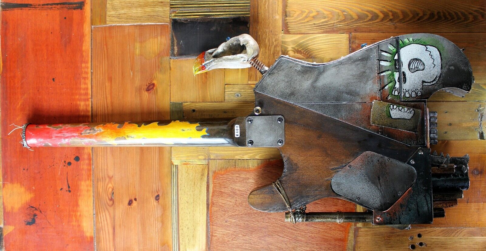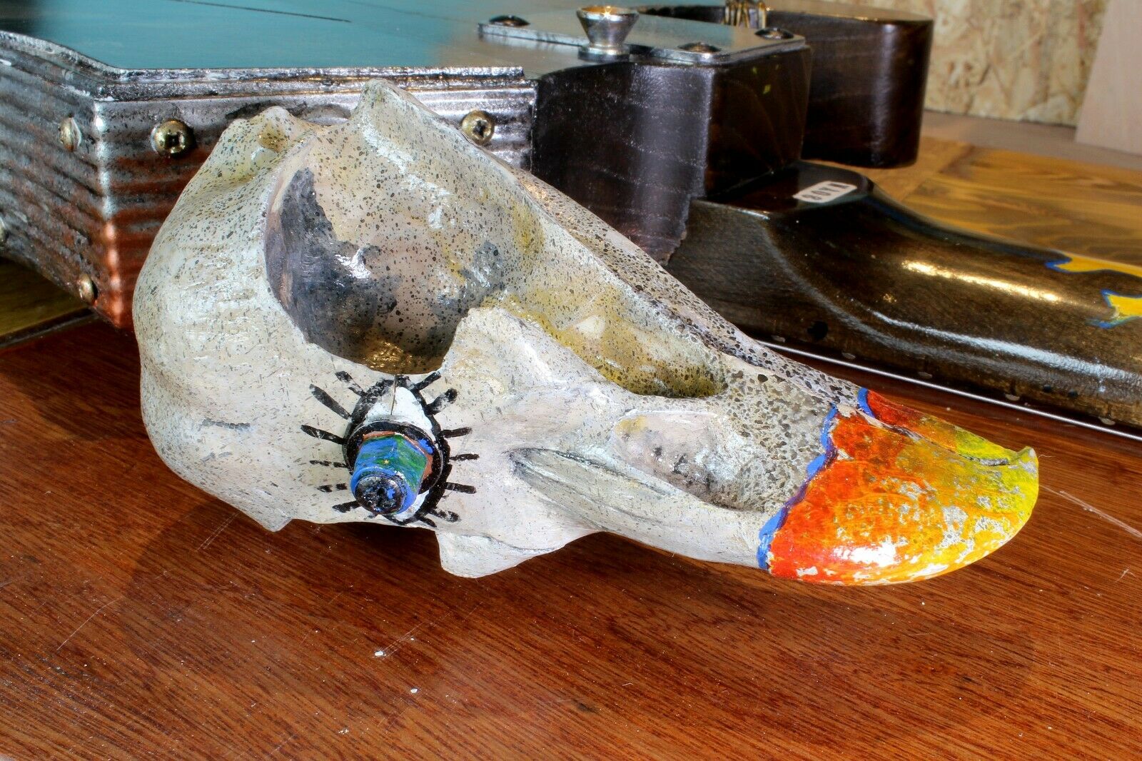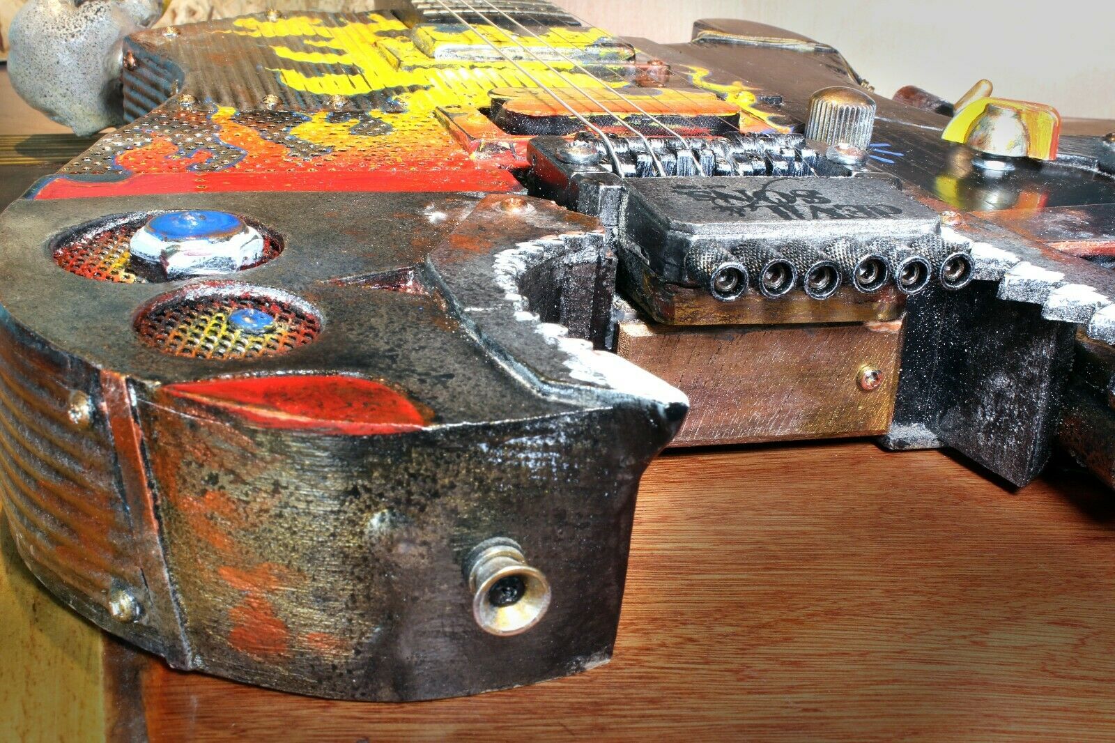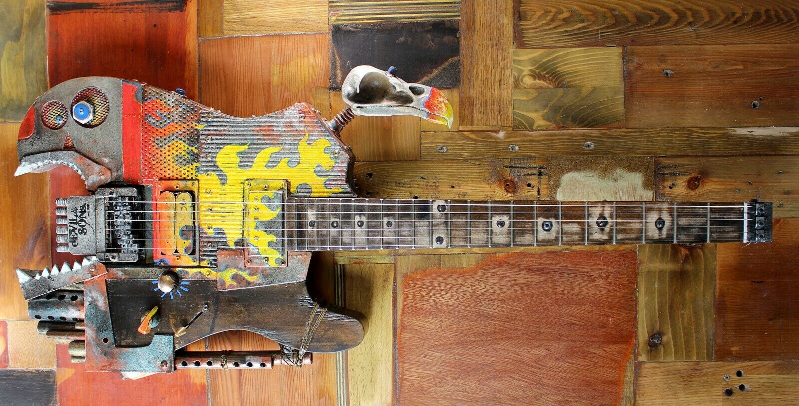 The guitar is sculpted from wood, metal parts, and a resin replica bird skull. Yes, you heard me right, a bird skull. Because what screams “I’m a badass post-apocalyptic warrior” more than a skull of a tiny bird?