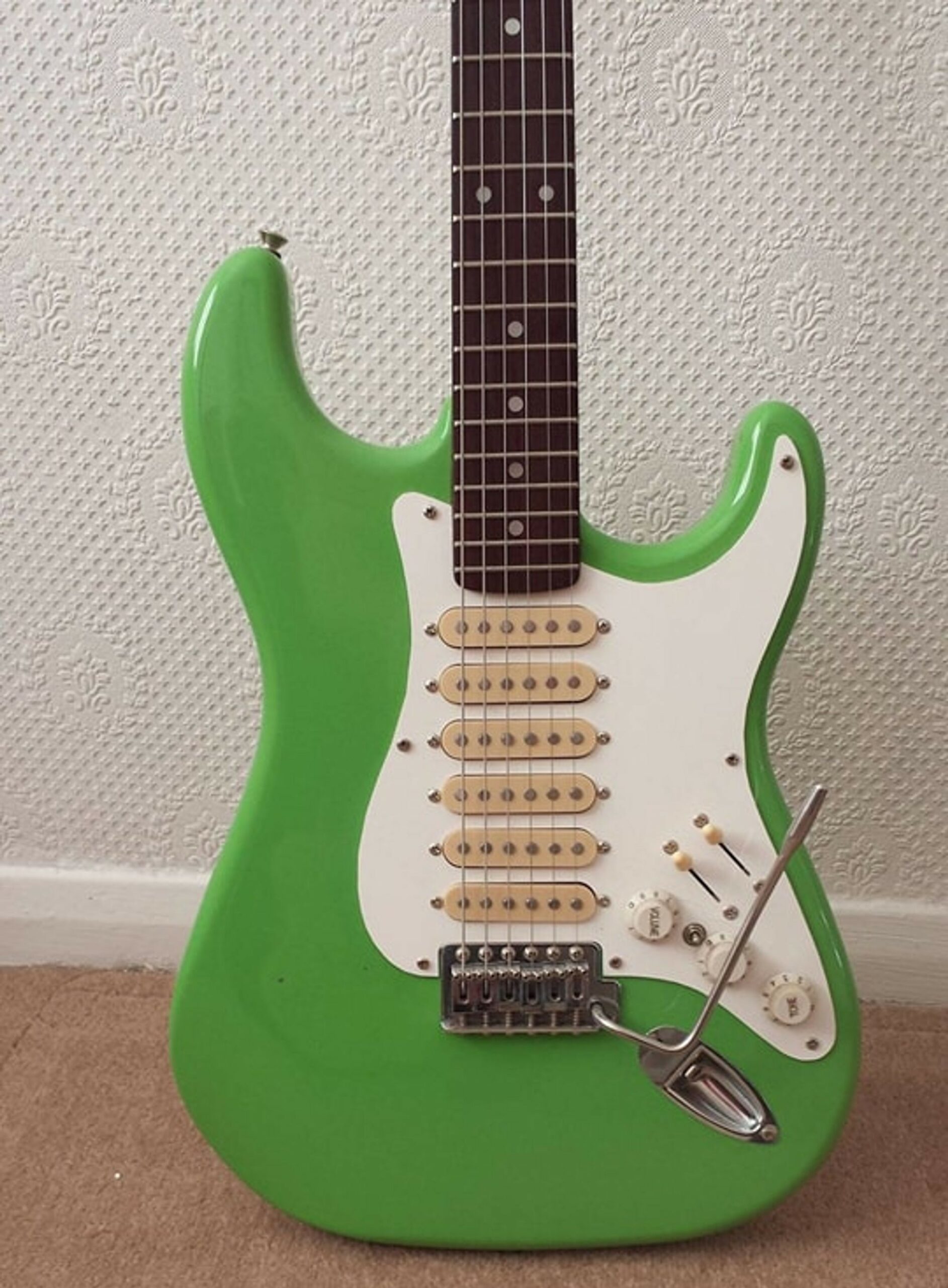 So, you think your Stratocaster is versatile? Think again. Introducing this Green Machine, a Stratocaster that doesn’t settle for the usual three pickups. No, it crams in six single-coil pickups, two five-way selector switches, and an extra mini-toggle switch for good measure. Because why not?