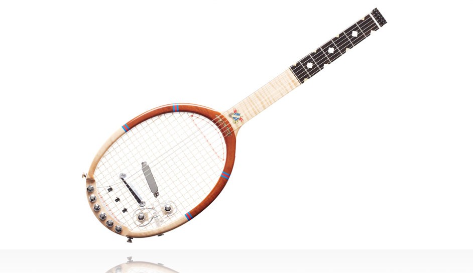 Well now you can do that with an actual tennis racket guitar from Swinger Guitars… Not sure I want one but it sure looks funny !