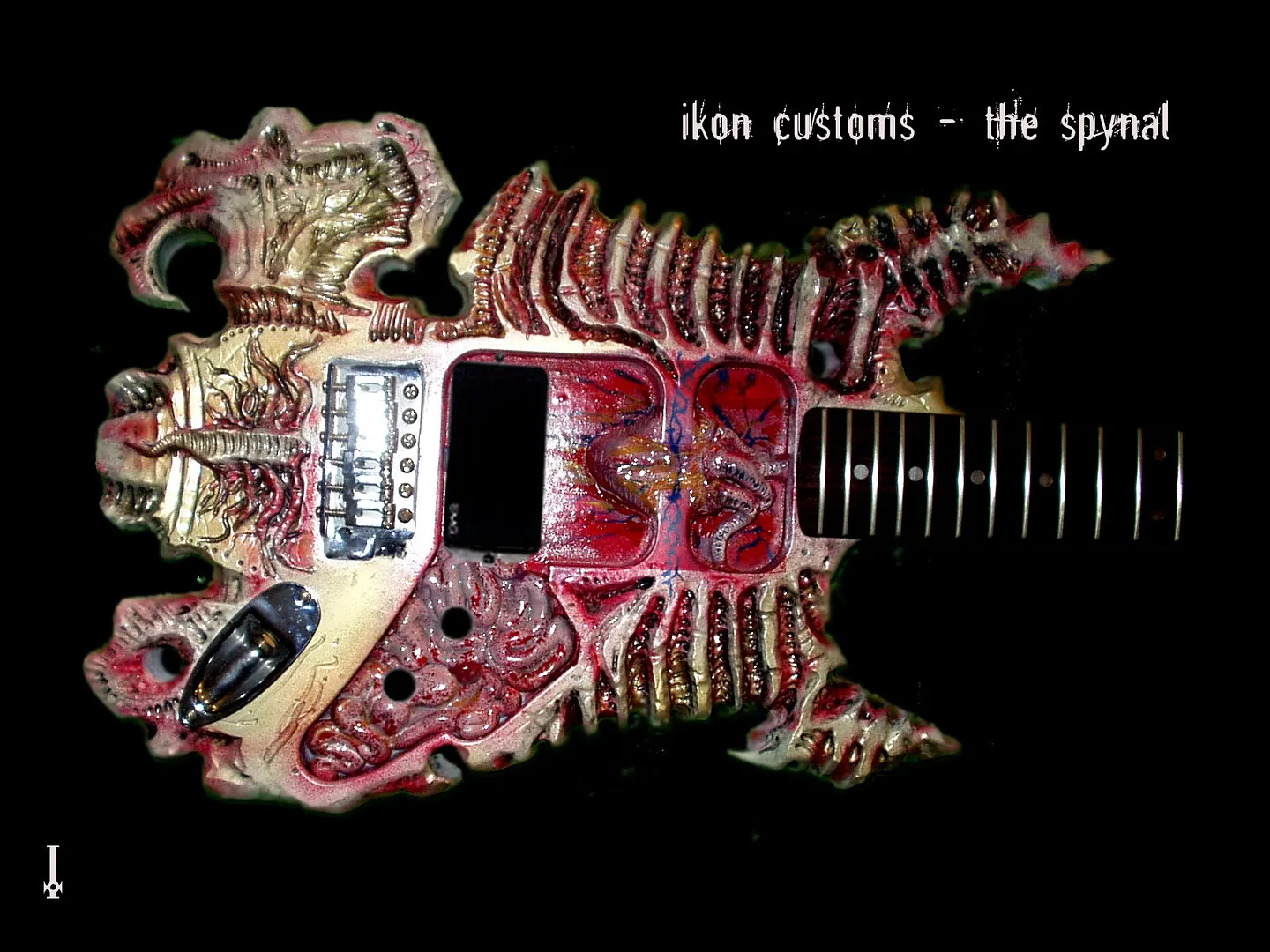 Ikon Custom guitars was a brand based in Houston, TX. They were specialized in bio-mechanical art dedicated to extreme music artists. Needless to say they were going for the metalheads out there!