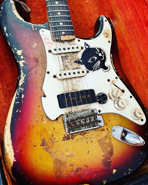Meet the Black Cat Nonsense Strat, a 1971 Fender Stratocaster that’s been butchered: A natural relic with battle scars and a black cat sticker to add some flair. That guitar has seen better days.