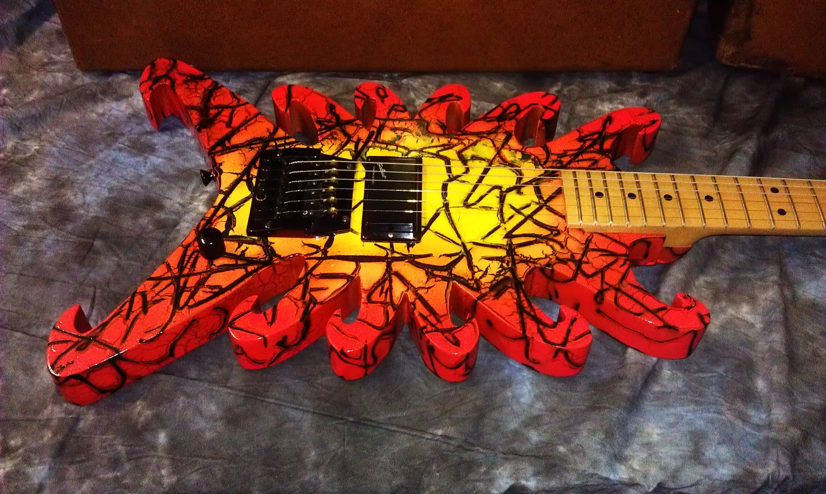 The customer liked it but the infamous guitar had no color yet. The suggestion of a Sycho Sonic Sunburst was made. “Sycho Paint” sounds like a perfect description of all the feelings generated by this guitar.