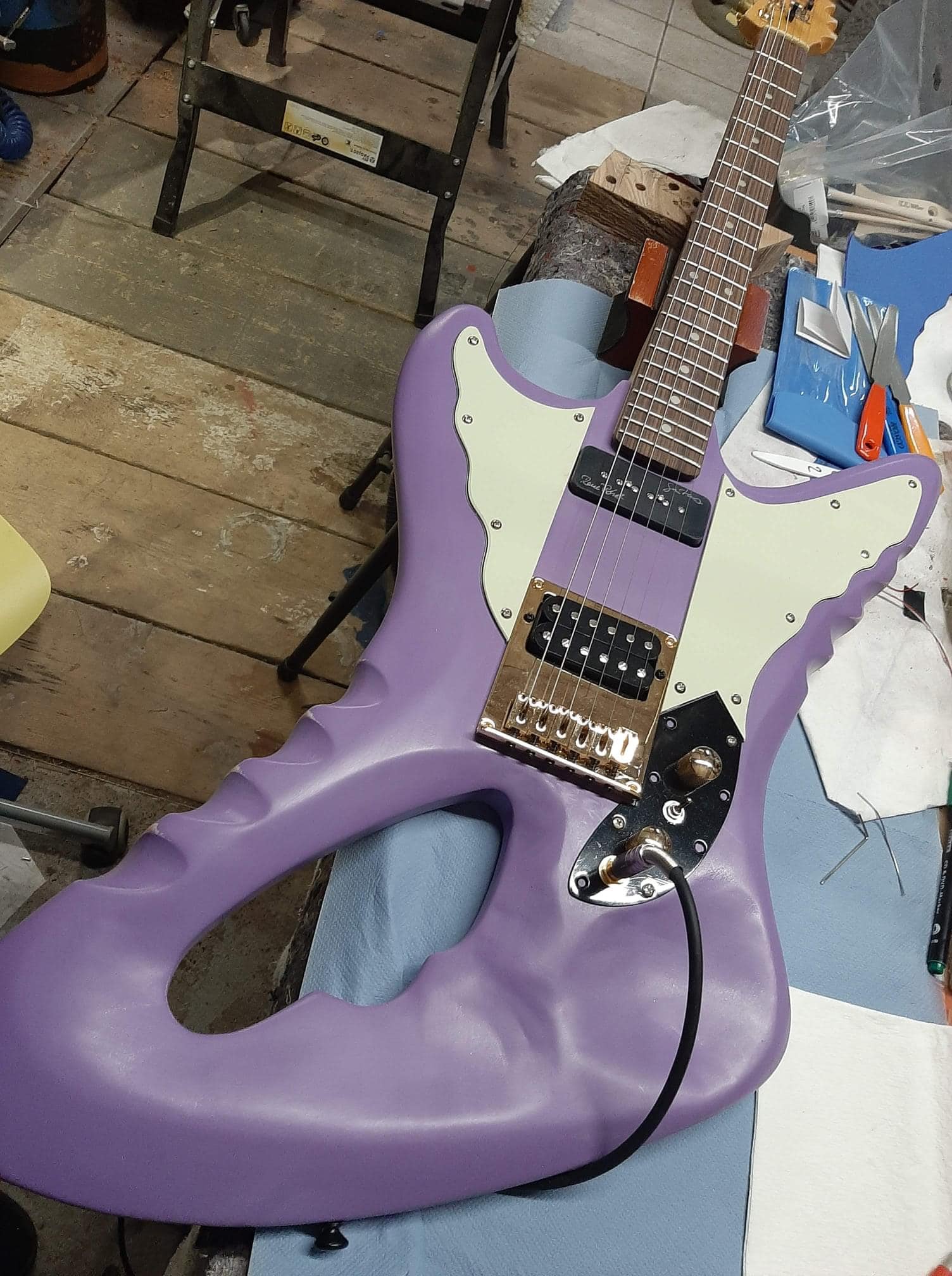 But now, combine this color to the soft curves of the guitar body. Indeed, instead of the harsh, angular lines you’d expect from an Explorer or a Klingon design, this instrument takes a detour into the realm of organic shapes. It’s like a Cronenberg movie on steroids, where the Klingon weapon morphs into something that wouldn’t look out of place in a surrealist art exhibition.