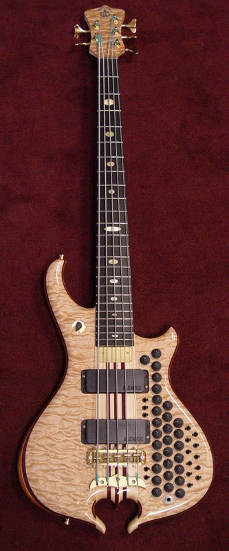 The bass is clearly an Alembic bass. Alembic made some basses with a sick number of control knobs and switches. Yet, it is unclear it this bass is a real bass – a Pinterest user says it is a Mark King 5 Omega Custom (link in the photo caption) – or a photoshop one !