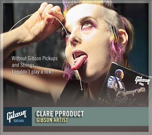 Troubling ad ! With her tongue out and a guitar string pierced through it, Clare Product is taking the phrase ‘playing a lick’ to a whole new level ! Let’s hope that Gibson strings tastes like rock n’ roll.